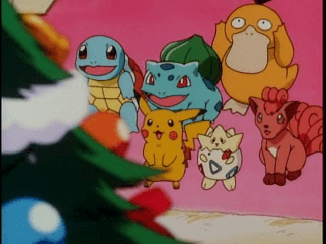 Summary: Ash, Brock, and Misty leave their Pokémon in their cabin while they buy Christmas Cake. Togepi puts on a Christmas hat, and everyone looks at their reflection in the Christmas ornaments. Squirtle and Bulbasaur have a disagreement over a cookie, and Vulpix gets stuck in a stocking. Psyduck tries to pop some champagne, while Bulbasaur and Vulpix almost ruin the tree. Squirtle ends up pulling all of the lights off of the tree, and Psyduck’s uncorking is the Christmas tree’s demise. Pikachu freaks a bit and he makes the lights go out. They open a box with a spinning tree and music, what a quaint scene. The team made the tree, and everyone enjoys Christmas together.