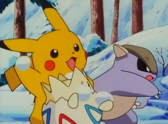Later, our crew plays in the snow. Onix is a little overzealous when he shakes the ground so much that snow buries Onix. Togepi and Pikachu stumble into a friendly Kangaskhan and its baby. Squirtle tries to get it to play with them, and Kangaskhan laughs at Pikachu getting hit by a snowball. Kangaskhan starts throwing at Bulbasaur and Squirtle. Kangaskhan and Togepi start sledding with Pikachu riding in the back. Bulbasaur uses Squirtle as a sled and our crew flies over Brock and Misty’s Pokémon who join in. Everyone realizes they are headed for water, but the mother Kangaskhan stops Onix’s roll. Everyone says goodbye to Kangaskhan.