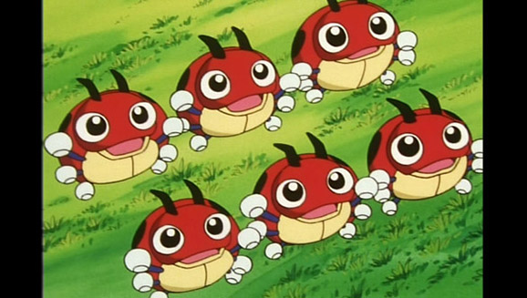 Summary: Our friends start walking from Cherrygrove City where Team Rocket has devised a plan for them to collapse into a cage that is connected to a bridge. Team Rocket washes out, but our crew has to find a way to make it over the river. How will they get across? Suddenly, a group of Ledyba fly past commanded by a girl Brock is smitten with. The crew gets an effort to cross the river by Arielle, and after crossing they find that the Ledyba help tend an apple farm by spreading pollen. Team Rocket plots to steal the whistle that control the Ledyba by doing a fake game show. Team Rocket stirs trouble after they start blowing the whistle, and the Ledyba ride off. Our crew tries to find them but Zubat just attracts other Golbat and Heracross eats sap. Meowth blows the whistle and gets Arbok to move and groove. Meowth uses the whistle to command Arbok to catch the Ledyba. But they are able to pull Team Rocket while spraying pollen. Our crew spot the pollen they are giving off, and they follow them to the spot where Arbok has stopped their momentum. Team Rocket send out their Lickitung and Victrebell and catch our heroes, but the Ledyba go hog wild and hit Arbok into them. Bulbasaur cuts the net while Ledyba avoid Team Rocket with Arielle’s directions. The Ledyba do a group tackle, and Arielle gets even closer to her Ledyba.