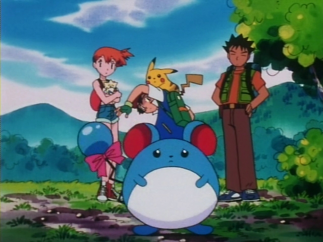 Summary: Ash has his Zephyr Badge, and our crew goes to a beautiful lake town. Brock is hungry for some love, and sees a perfect girl with a parasol. A Marill pops out of the bushes, and Misty is smitten. She throws a Poke Ball that hits Marill, and Marill starts a hard, hard cry. Team Rocket offers the gang a ride, but ends up stealing Marill and Pikachu. Marill’s cries force Both of these cute Pokepals to fly down a hill after being dumped by Meowth. The girl with the parasol claims ownership of Marill, while Misty struggles with getting Marill to stop crying. She asks Marill to use its ears to search for her trainer. The lady, Willamina, is soothed by Brock who says he will find Marill however long they need. Marill runs into a Butterfree Water Gun range, but it hits a host of Caterpie, Weedle, and Beedrill which scare our trio. Brock catches Willamina, and our friends reunite with Marill who is still being chased by Beedrill. Misty, Pikachu, and Marill run away from the Beedrill, but are cornered by a mountain. Pikachu uses its Thundershock to chase the Beedrill away. Everyone is rained in, but Marill runs out as the thunder strikes a tree. The tree almost hits Marill, but Misty saves it just in time. They have a tight bond, and eventually the rain clears. As the trio crosses a bridge, Team Rocket shakes it trying to get them off of it. Misty fends them off, and Chikorita catches Misty as she falls. The crew sends Team Rocket flying, Chikorita hogs more of Ash’s attention. Willamina offers a stay at her lake house to Brock and the gang, but they decline.