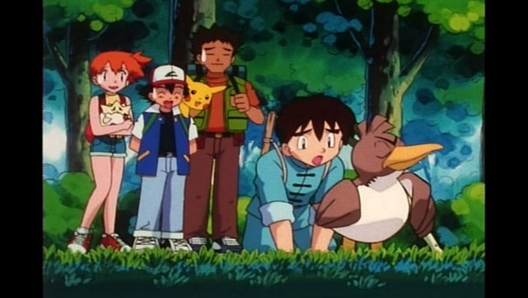 Summary: Our friends are walking through the Ilex Forest and Brock turns into a delusional old detective trying to find the way out. Team Rocket is hungry and tired, and our crew run into a boy with a Farfetch’d who won’t listen to him. The boy, Sylvester, gets advice from our friends to have Farfetch’d use the Cut attack, and he tells them of his father’s charcoal business. Ash calls Prof. Oak, who gives him advice on what to do now. Sylvester runs into the Pokémon Center and tells the crew and Nurse Joy that the Farfetch’d ran off, and Nurse Joy suggests that it is at his father’s work. Sylvester’s father is making charcoal, and he is pissed that Farfetch’d is lost and belittles Sylvester. Team Rocket are still struggling, and when they find Farfetch’d they go a bit nuts in their pursuit. Sylvester and our gang regroup at the shrine of Celebi, and they let all of their Pokémon out to look for Farfetch’d. Team Rocket use their Pokémon to scare Farfetch’d, capturing its leek to make it weak. They capture the duck, but run into Ash and Sylvester. Team Rocket make a hasty exit, but Bulbasaur and Chikorita break the net Farfetch’d is kept in. Weezing drops some serious sludge, and Arbok almost finishes them off with a Poison Sting. Brock, Misty, Onix, and Poliwag show up to help. Ash directs his Pokémon to work as a team to Sylvester’s delight. Sylvester idolizes Ash, and learns that Pokémon need to have one mind with their trainers. Sylvester grabs Farfetch’d’s leek, and they work together to knock Team Rocket out. Sylvester’s Dad is impressed with him, and our friends make another friend on their journey.