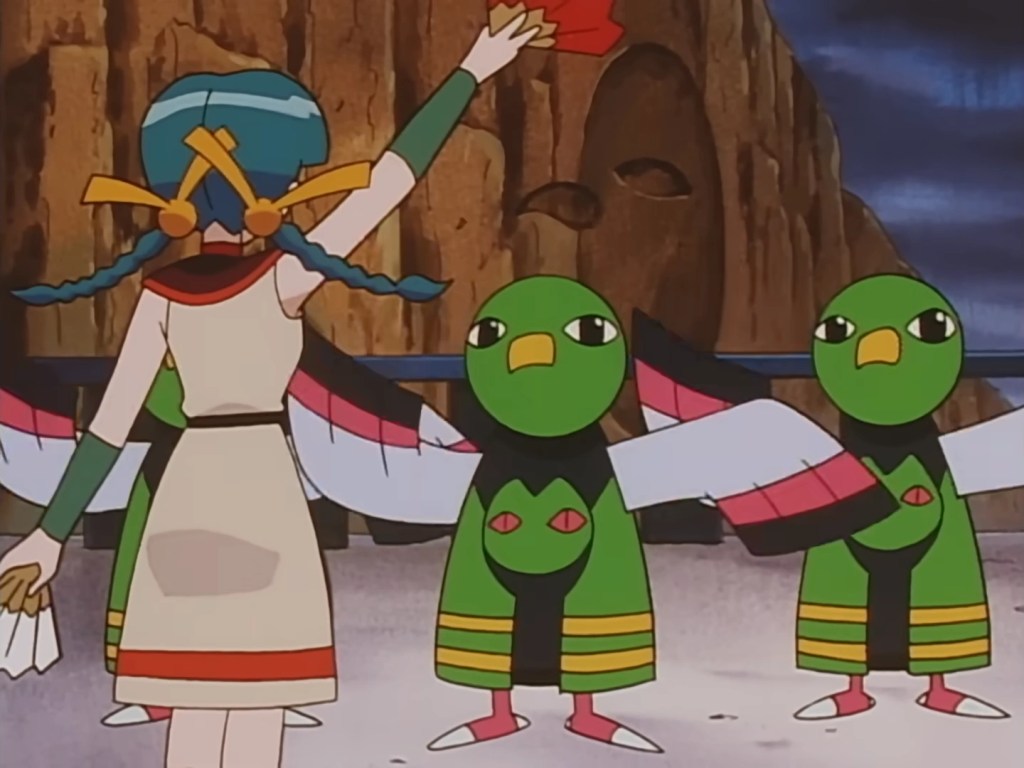 Summary: Our heroes are walking along a path to Mahogany when they suspect Team Rocket set a trap, which they did. Team Rocket and our heroes jump on it, eventually it breaks… shocker. But this time, they go into an even larger hole that goes into a bunker of sorts, a woman runs by who has them follow her… and then she tells them she is a fortune-teller with the help of Xatu.. how did we get here? Anyways, we get a name for the woman, Calista, and exposition that Xatu can see the future and are always in deep thought. Calista runs up the stairs into a doorway that opens up to a huge ampitheatre.. It looks like Calista is the resident fortune-teller who tells everyone it won’t rain.. And it does. Calista runs away thinking the rain is the coming of a doomsday, the heroes follow. Meanwhile, Team Rocket is left alone to the audience in a confusing twist Jessie rock/paper/scissors with the crowd… this is getting super confusing. Calista shows that the Xatu prediction is actually an antenna that shows the weather. Xatu looks back into the future and indicates that one of the humans in the room can predict the weather, Jessie tries her hand at it but she quickly backtracks, Xatu faints trying to see into Jessie’s future. The Xatu predict “the day”, a day of disaster and hard rain that will destroy everything. Calista laments her role as the town fortune-teller, saying that she can’t predict the future and wouldn’t want to… she then decides to go and tell the villagers to flee for their lives because of a great flood. When she tells them of their fate, the villagers give valuable peace offerings which Team Rocket wants to pawn for money to give to Delibird who shows up to collect payment. Xatu helps blast Delibird and Team Rocket off before giving a prophecy of a flood coming today and that everyone needs to leave right now. Xatu tells Calista that her life shouldn’t be told by a storyteller, they help transport her and our heroes out of harm’s way of the flood. Calista dreams of being a weather reporter while our heroes leave.. So long for this very confusing episode.